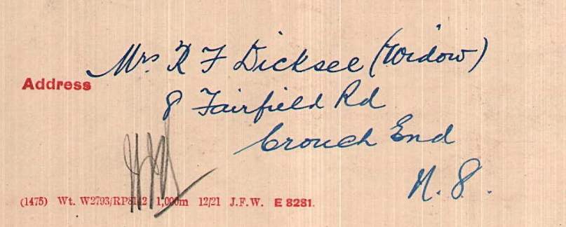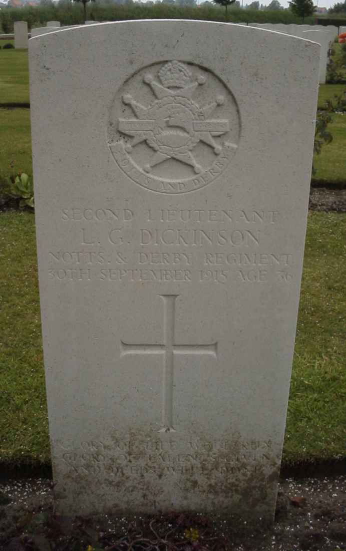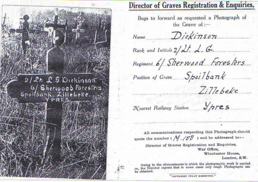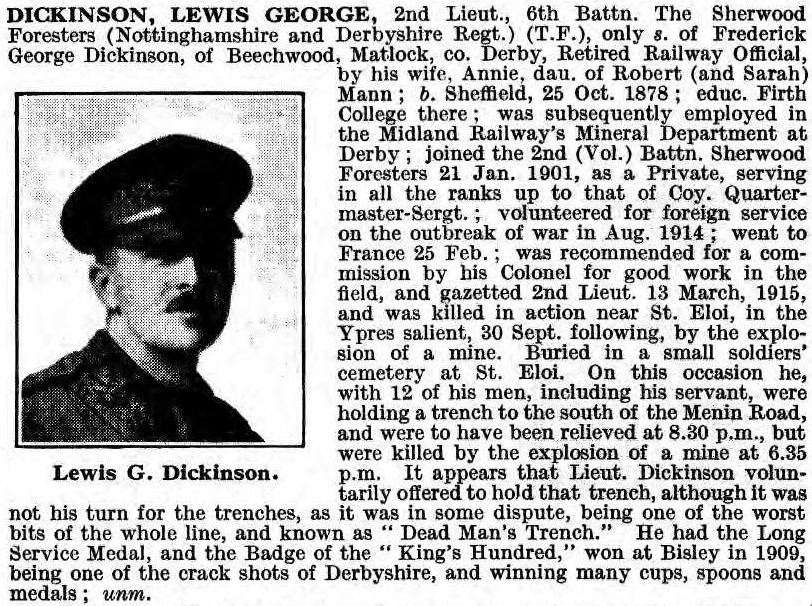 Lewis George Dickinson was born Sheffield on 25th October 1878 the son of Mr Frederick George Dickinson and Mrs Annie Dickinson (nee Mann). He was educated Firth College and subsequently employed in the Midland Railway’s Mineral Department at Derby.