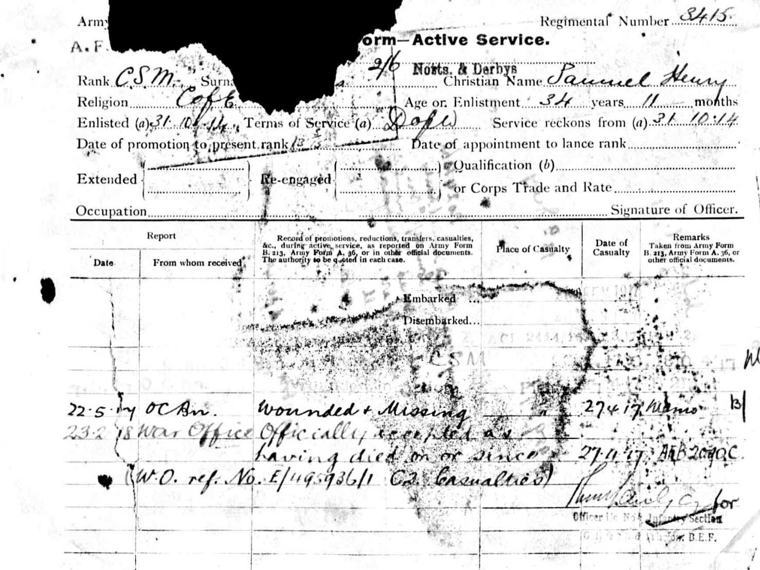 Samuel re-enlisted into the 2/6th Battalion in October 1914 aged 34. He had previously served 9 years with the 2nd Volunteer Battalion Sherwood Foresters.