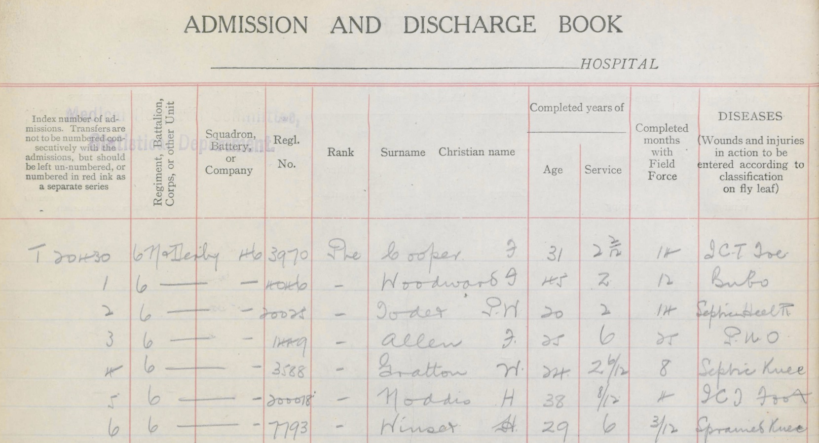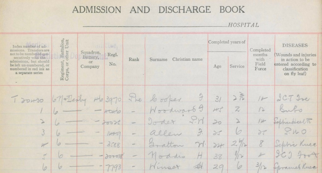 Around August 1916 Walter was posted to the 1/6th Battalion and sent to France (information taken from XI CCS Admission and Discharge book). In March 1917 he suffered from a septic knee and was sent to the XI Casualty Clearing Station in Varennes. Seven other men from the 1/6th Battalion were also sent by sick convoy to the XI CCS.