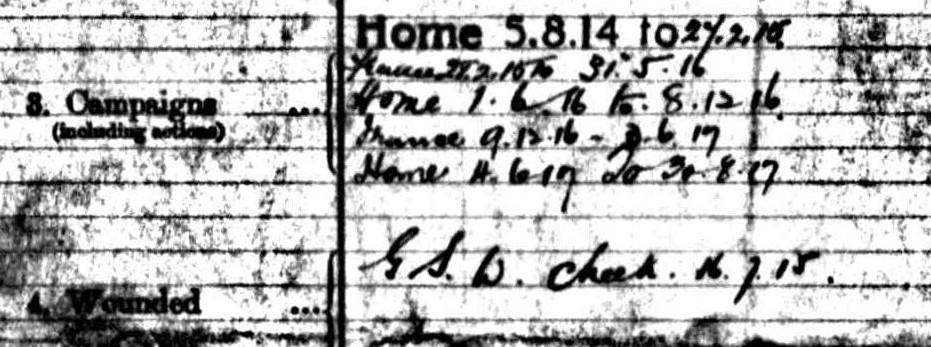 In May 1917 he was admitted into the 1/3 NMFA with influenza but this later developed into pulmonary tuberculosis and he was transferred to England and discharged in May 1917. After which he went into the Chesterfield Sanatorium.