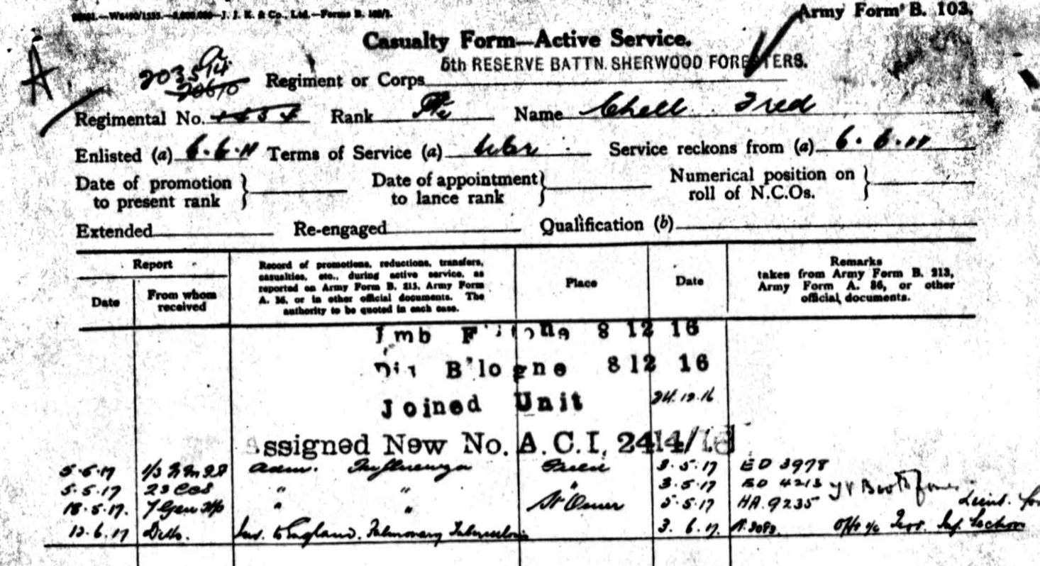 Fred arrived in France with the 46th North Midland Division in February 1915 and suffered a gun shot wound to the chest on the 16th July 1915. After treatment in England he returned to France in December 1916 and served with the 1/5th Battalion.