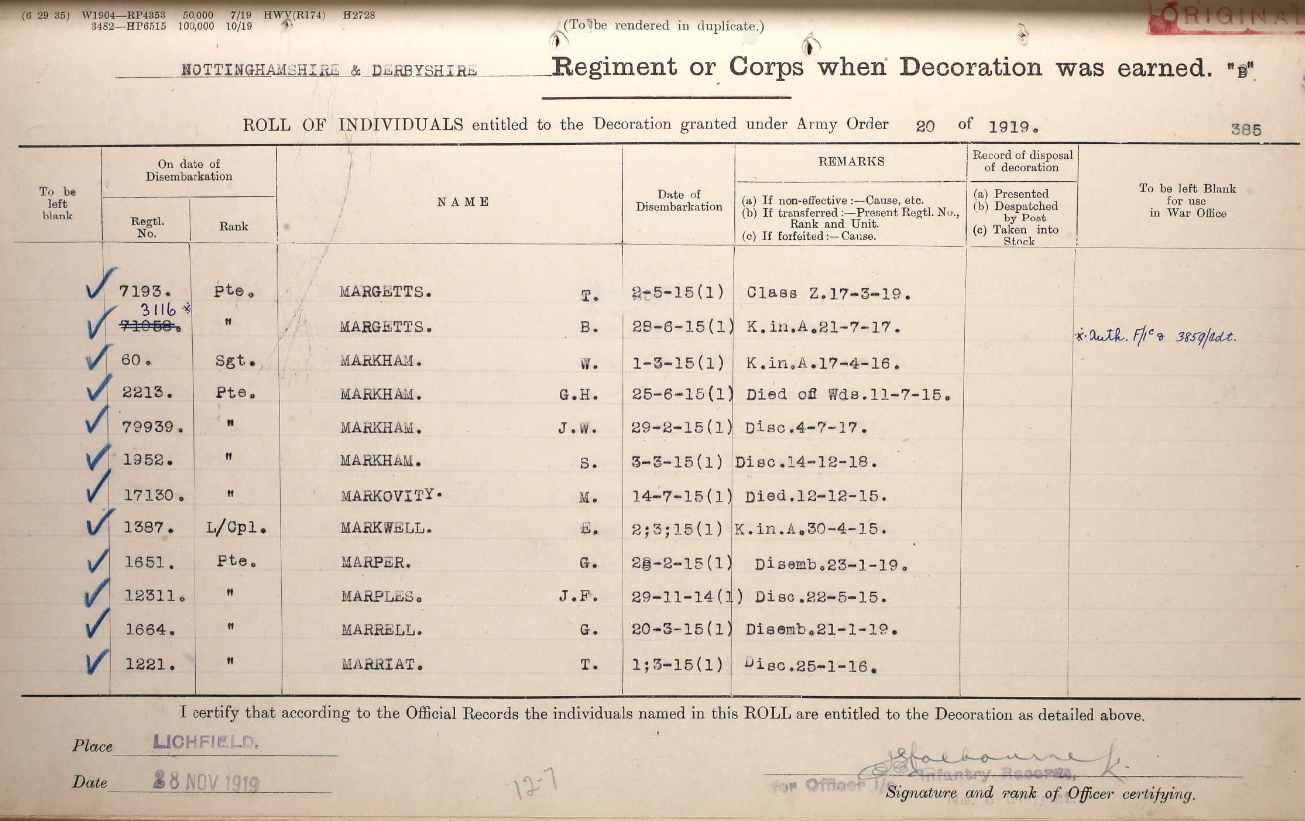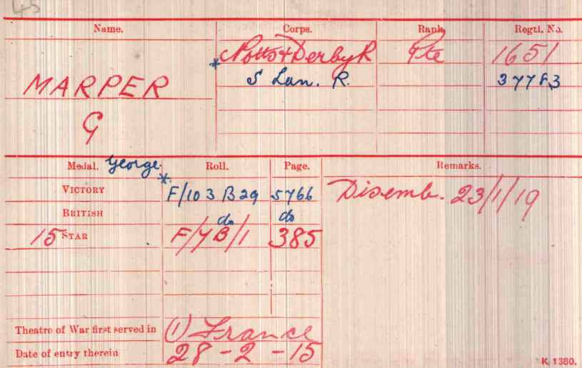 Although the Medal Index Card records that George served with the South Lancashire Regiment, this is not reflected on the Official Medal Roles, which confirm that he only served overseas with the 1/6th Battalion.