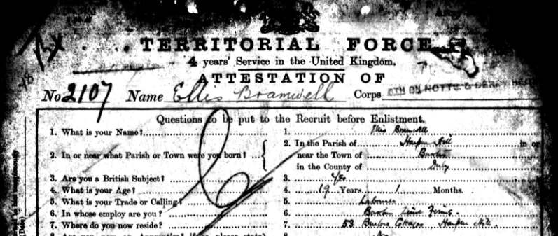 2107/240417 Pte Ellis Bramwell A Pre-War Territorial who enlisted in January 1914 An original member of “B” Company and arrived in France in February 1915. Wounded on 4th November 1917 during a trench raid at Hill 70 1914-15 Trio awarded to Ellis Bramwell Attestation of Ellis Bramwell into “B’ (Chapel-en-le-Frith) Company in January 1914 Wounded on a raid of the German Trenches on the night of the 4th November 1917. See here. Treated for his wounds in a Military Hospital in Canterbury Later joined the Royal Engineers Share this: Click to share on Facebook (Opens in new window) Facebook More Click to share on X (Opens in new window) X Like Loading...
