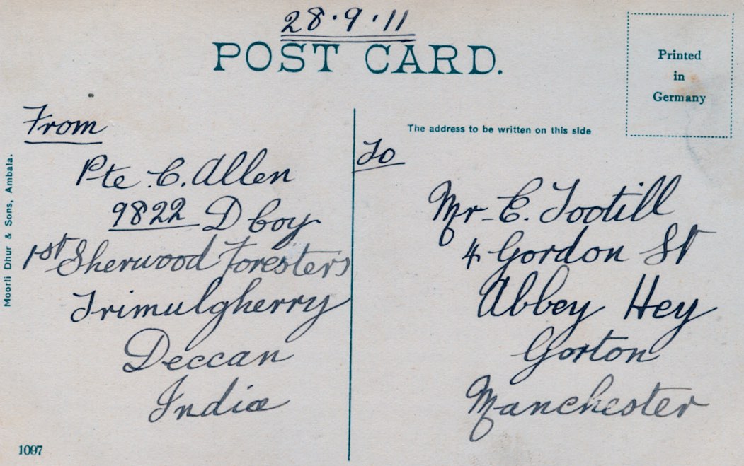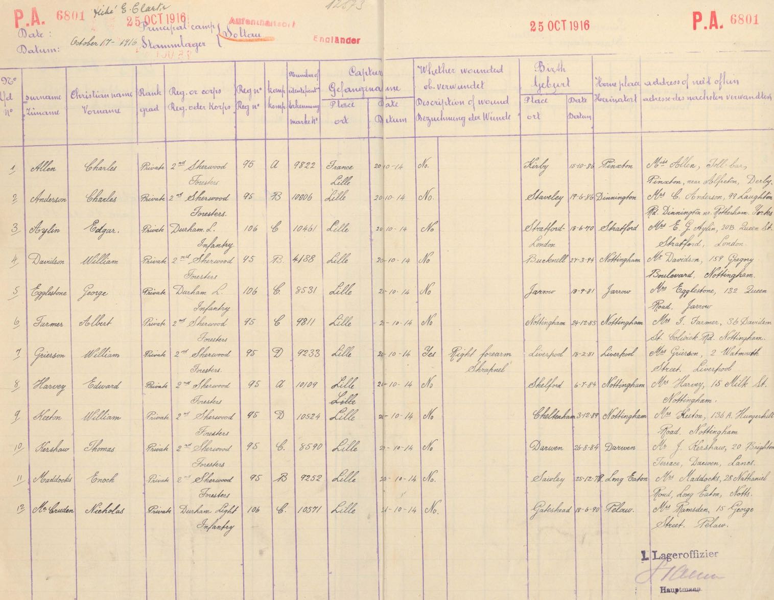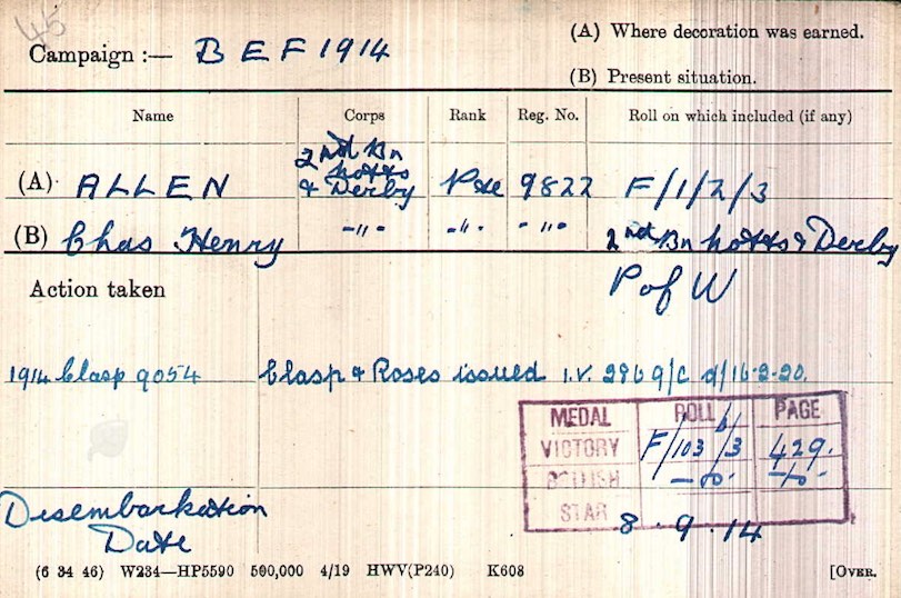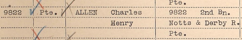 9822 Pte Charles Henry Allen Pre-War Regular stationed in India Served with 1st Battalion at Trimulgherry in Deccan Arrived in France with the 2nd Battalion Sherwood Foresters in September 1914 Captured by the Germans the 20th October 1914 Share this: Click to share on Facebook (Opens in new window) Facebook More Click to share on X (Opens in new window) X Like Loading...