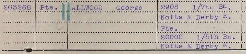 The first to be renumbered in this series was 2908 George Allwood (below) of the 1/7th Battalion who was renumbered 20000 prior to receiving 203268 during the 1917 renumbering.