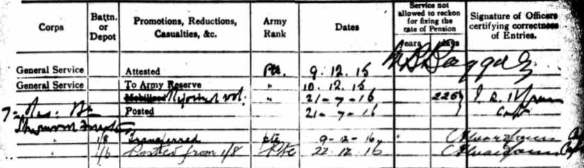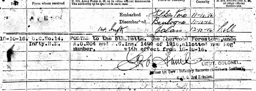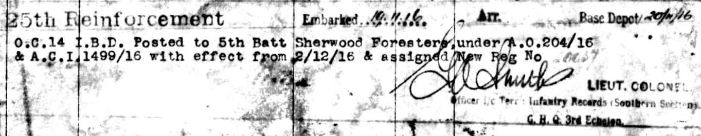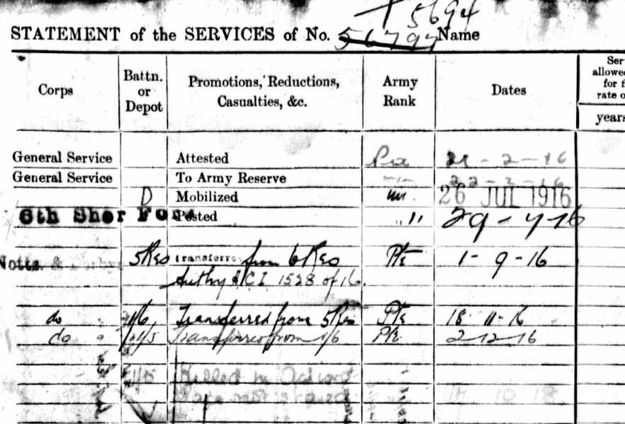 - Mobilized on the 26th July 1916, posted to the Sherwood Foresters Depot and given number 56797.
