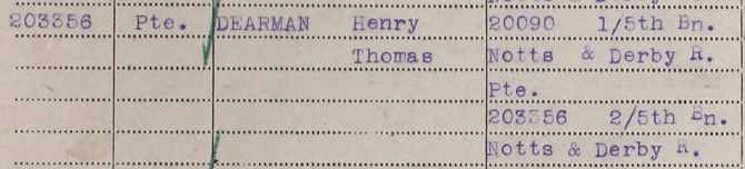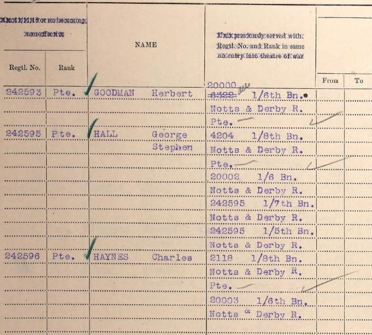 Recording the transfer of men between the Sherwood Foresters Territorial Battalion.