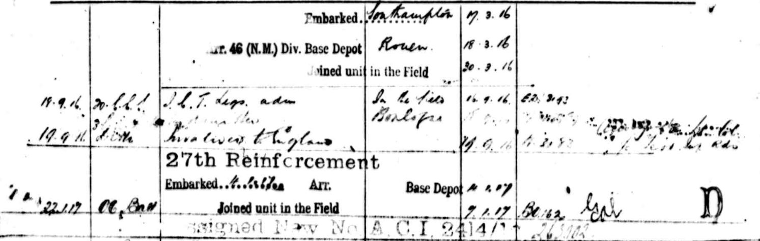 He returned to France with the 25th Reinforcement on the 19th November 1916 and was posted to the 5th Battalion from the 14th Infantry Base Depot at Calais.