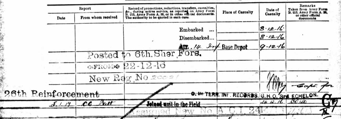Page 1 of his Army service record recording that Thomas arrived in France on the 25th February 1915 and was first wounded on the 17th July 1915 with a GSW in the head. After returning to the 1/6th Battalion he was again wounded with a GS wound on the 12th September 1915 and transferred to Hospital in England.
