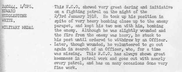 Military Medals awarded to Cpl EH WHITE, Pte A KNOWLES and L/Cpl W THOMPSON, all “D” Company for Conspicuous Gallantry during enemy raid near HULLACH on Jan 2nd 1917.