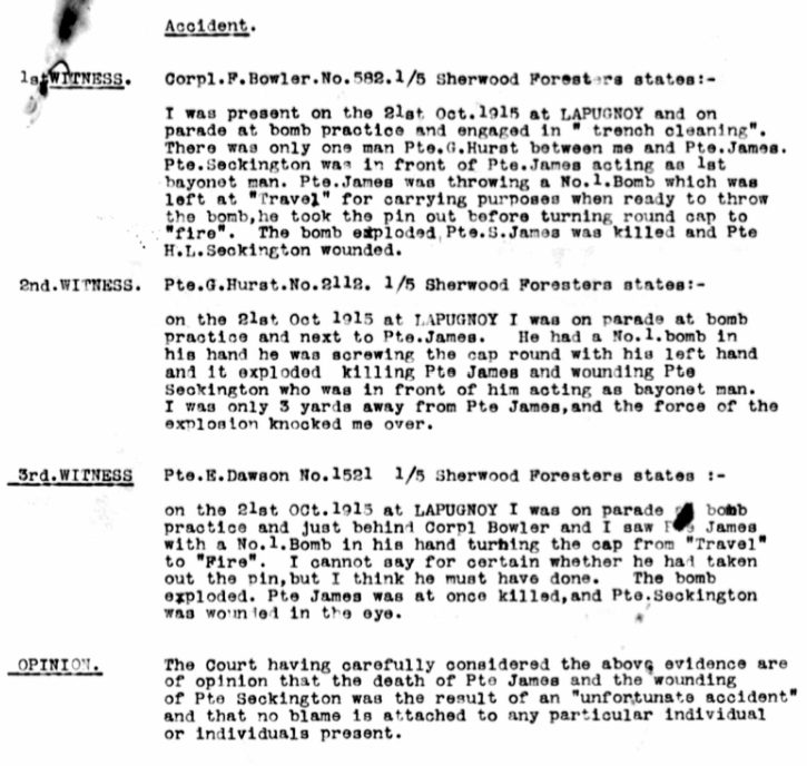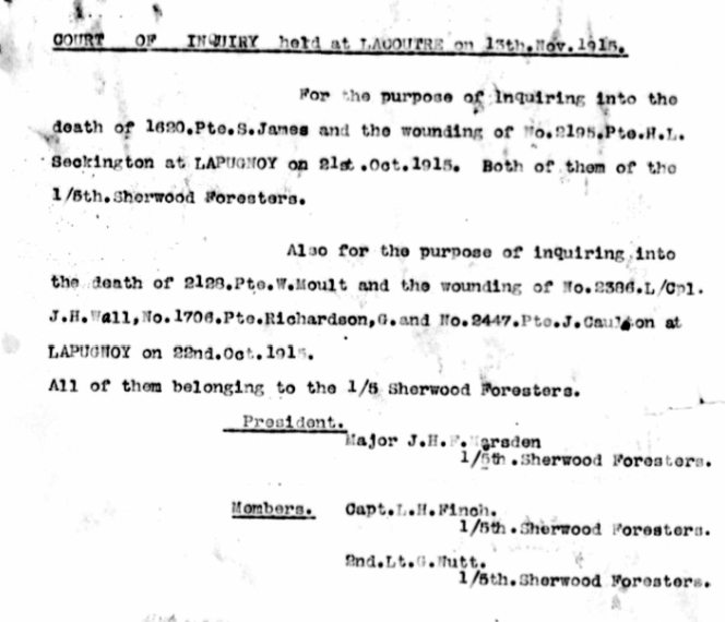 Held over the accidental deaths of 1620 Pte Samuel Joseph James (Long Eaton) and 2128 Pte William Moult (Albert Village) and the accidental wounding of 2195 Pte Harry Leslie Seckington, 2386 L/Cpl John H Wall (discharged 1916), 1706 Pte Arthur Richardson (discharged 1916) and 2447 Pte James Caulton (transferred to 21st Battalion) at LAPUGNOY on the 21st and 22nd October 1915.