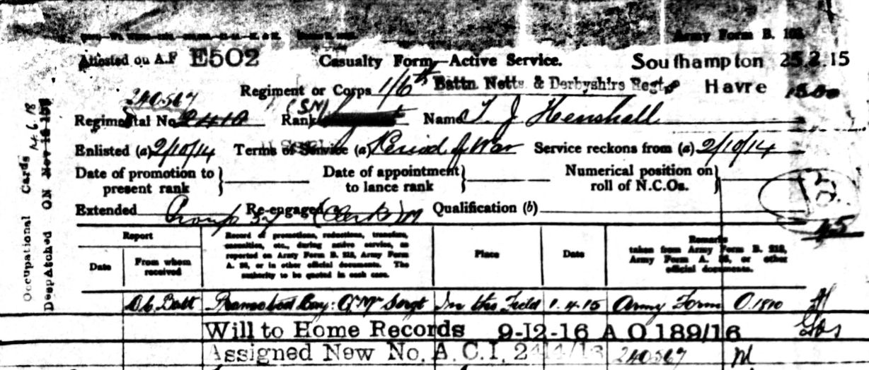 • 2410 Sergt. T.J. Henshall to be Coy. Q.M. Sergt.  ‘B’ Coy.