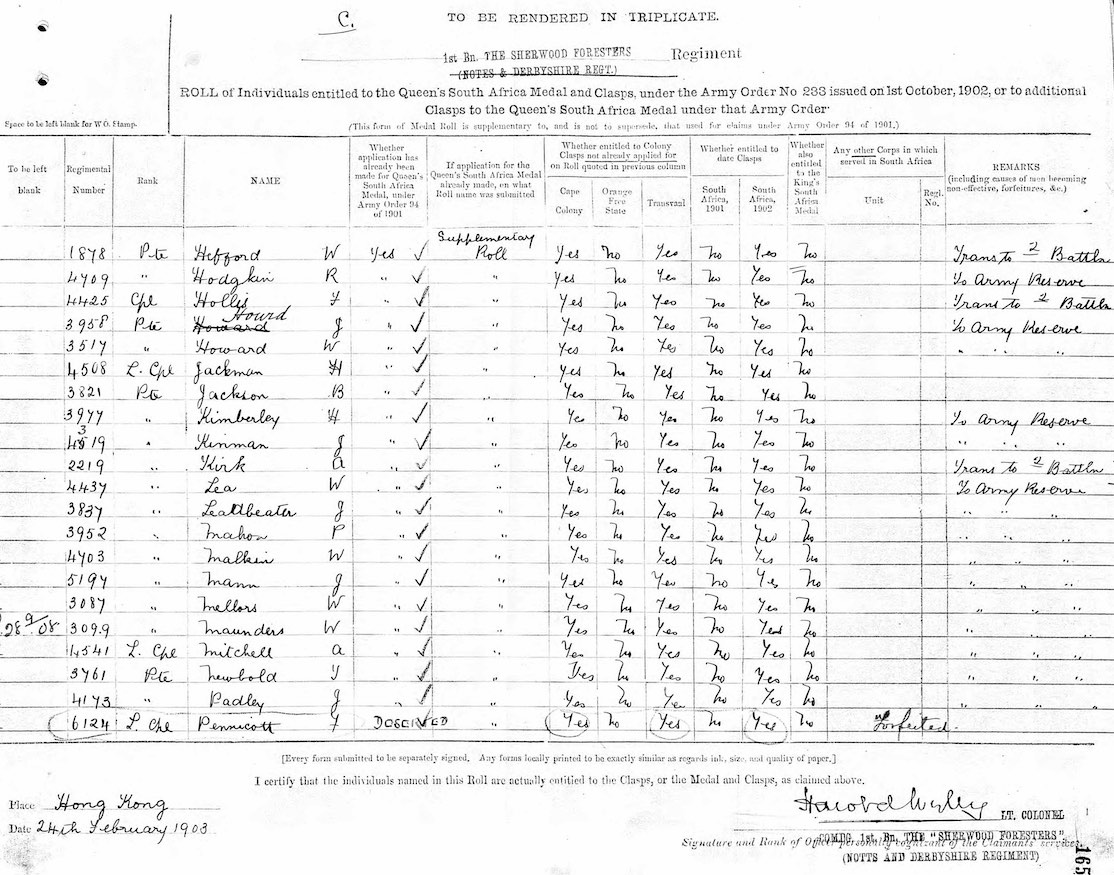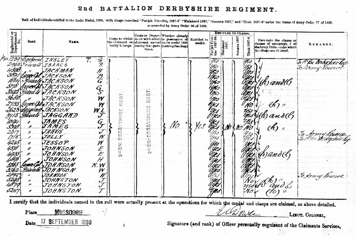 Herbert Henry Jackman served with the 2nd Battalion in the Tirah Campaign of 1897-98 (Awarded Medal and Clasps for Tirah & Punjab); the Boer War of 1899-1902 (QSA and Clasps for Cape Colony, Transvaal, South Africa 1902); Joined 1st Battalion at Rustenburg in South Africa on 8th April 1902 as L/Cpl.