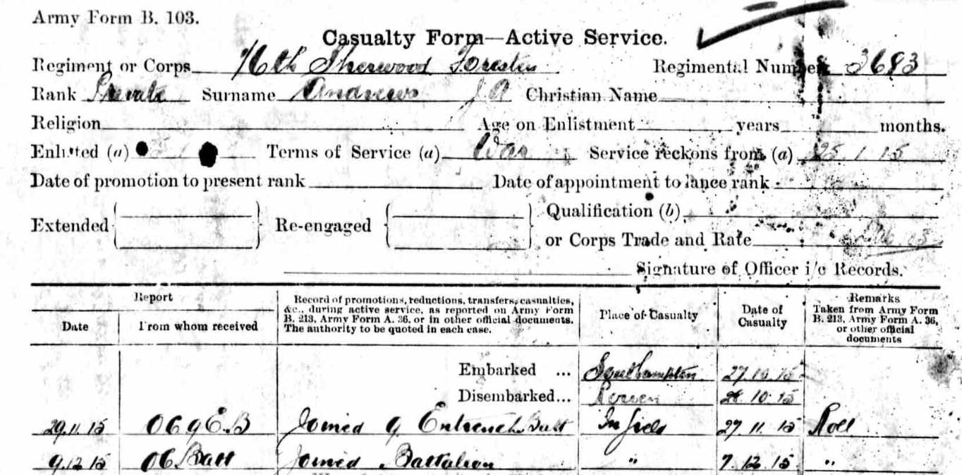 - 4060 Pte George Edward Abbott a miner from Whittington Moor who enlisted in March 1915 aged 32. He arrived in France with the 4th Reinforcement in October 1915 and joined the 1/6th Battalion in the field in December 1915.