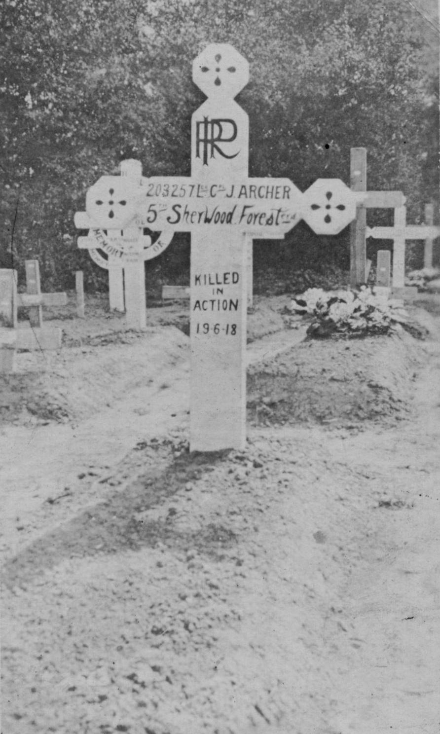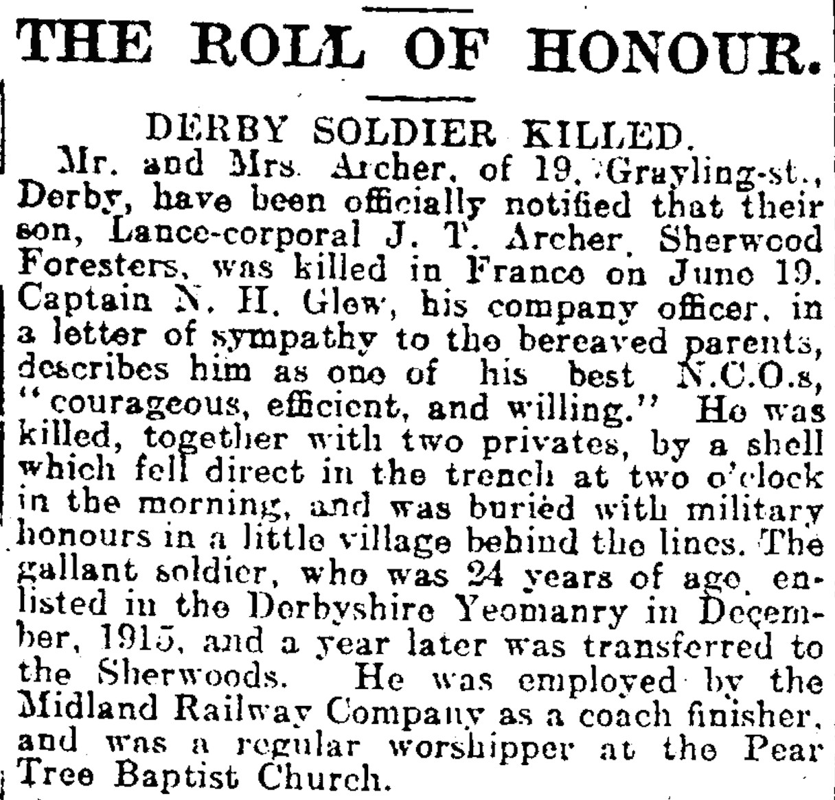 7627/203257 L/Cpl John Thomas Archer aged 24. Son of William and Catherine Archer of 19 Grayling St., Derby. Arrived in France in December 1916 and only served overseas with 1/5th Battalion. Previously enlisted in Derbyshire Yeomanry in November 1915.