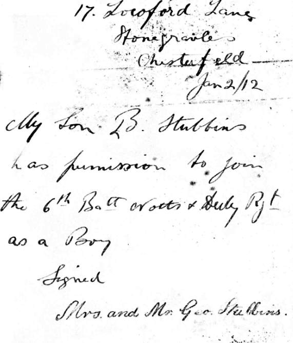 Benjamin was a labourer at the Hardwick Colliery Company and lived with his parents on Lockerford Lane in Stonegravels. He enlisted as a Drummer on the 3rd January 1912 aged 15 years and 9 months. As such he required a letter of authorisation from his parents.