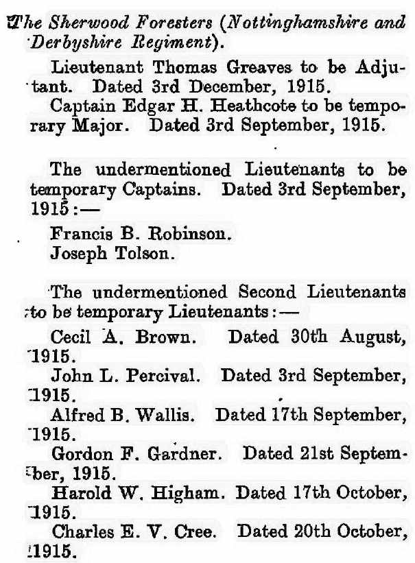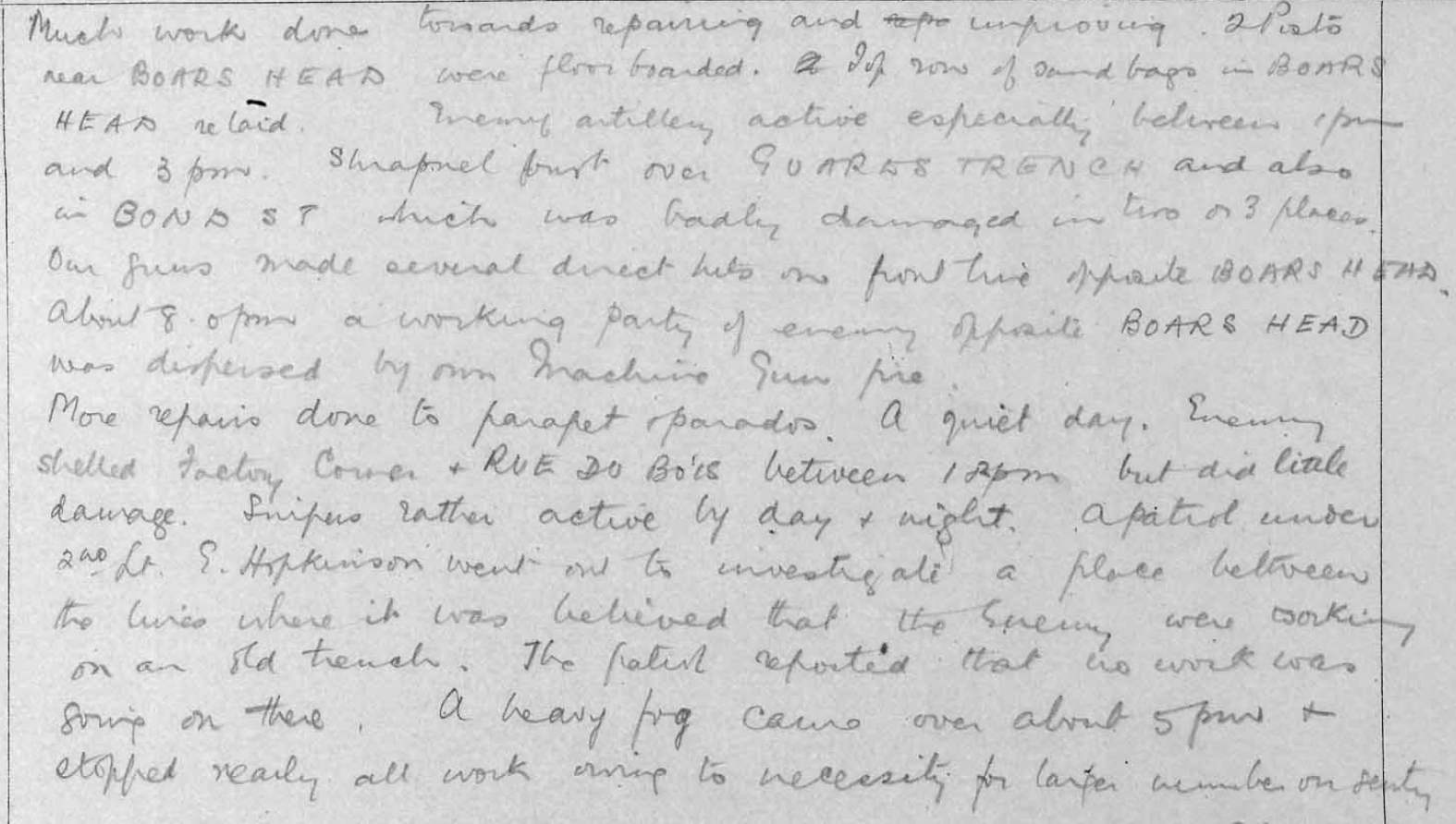 14.10.1915: Battn relieved by Guards and ordered to take over HOHENZOLLERN REDOUBT West face which had been captured. Owing to lateness of which only 3 platoons & 3 M Gun teams arrived before dawn & these were left with 5th Bn S.F. who took over. Capt HEATHCOTE with them.