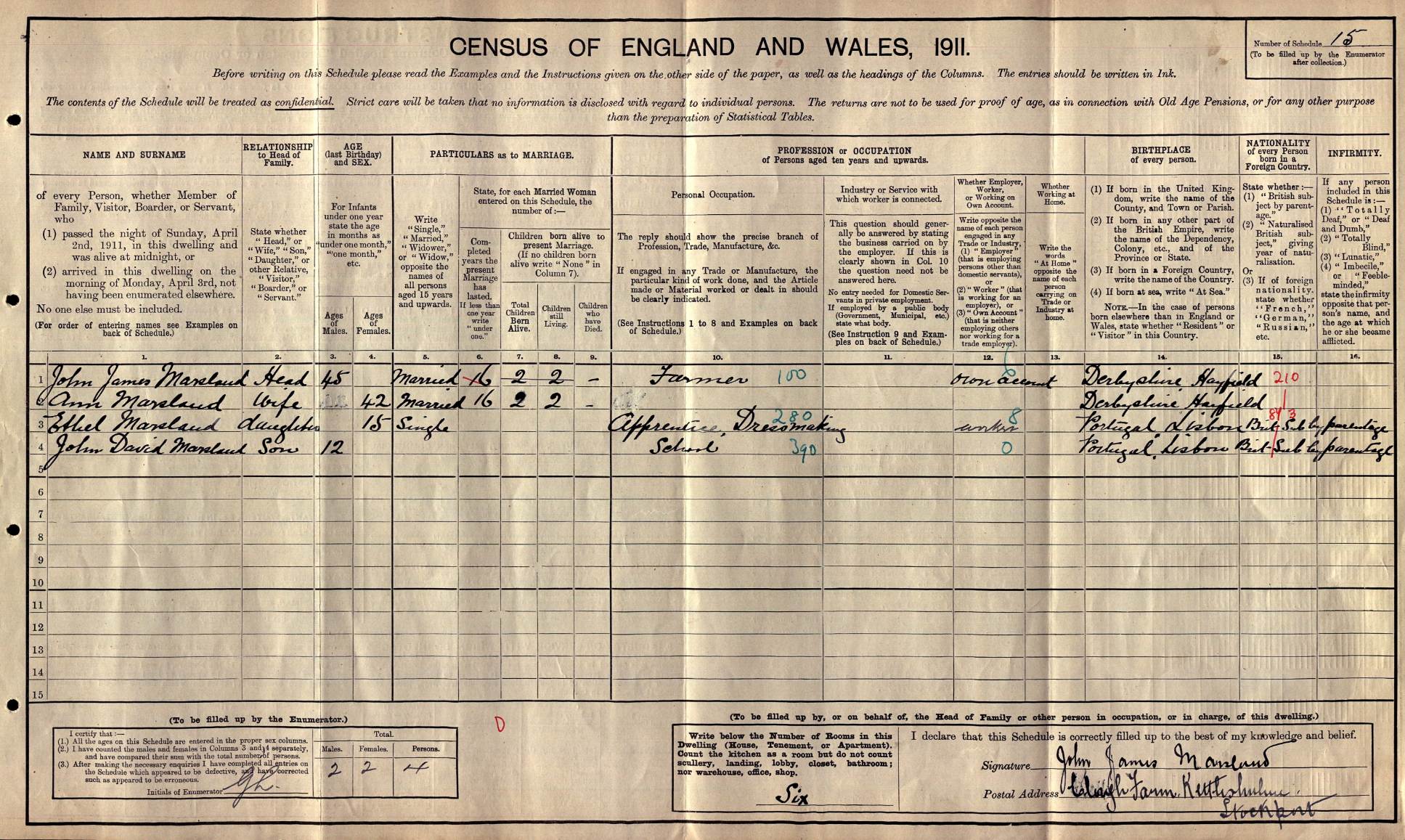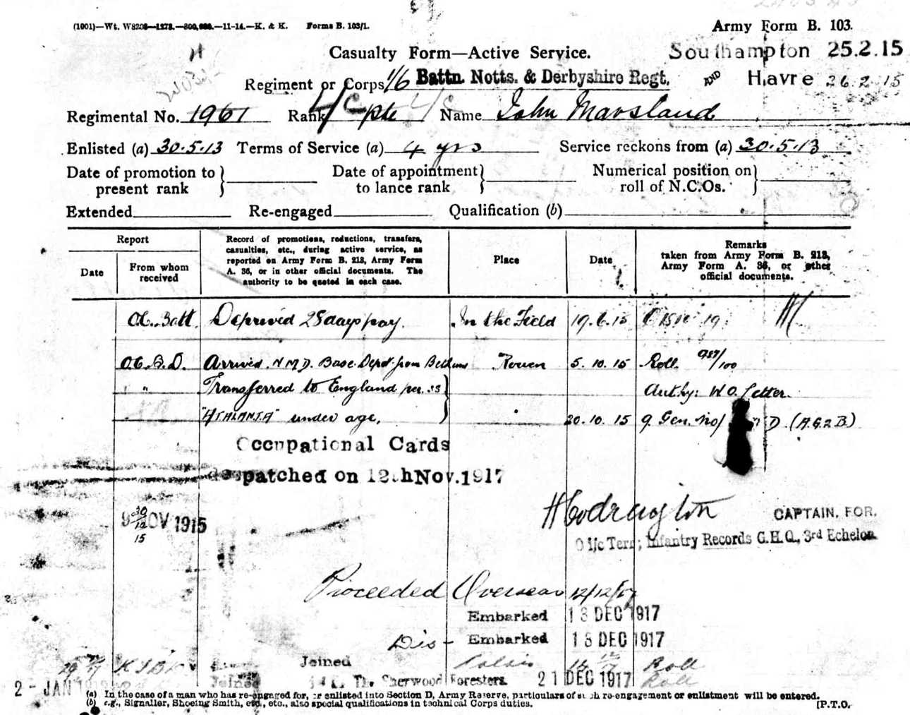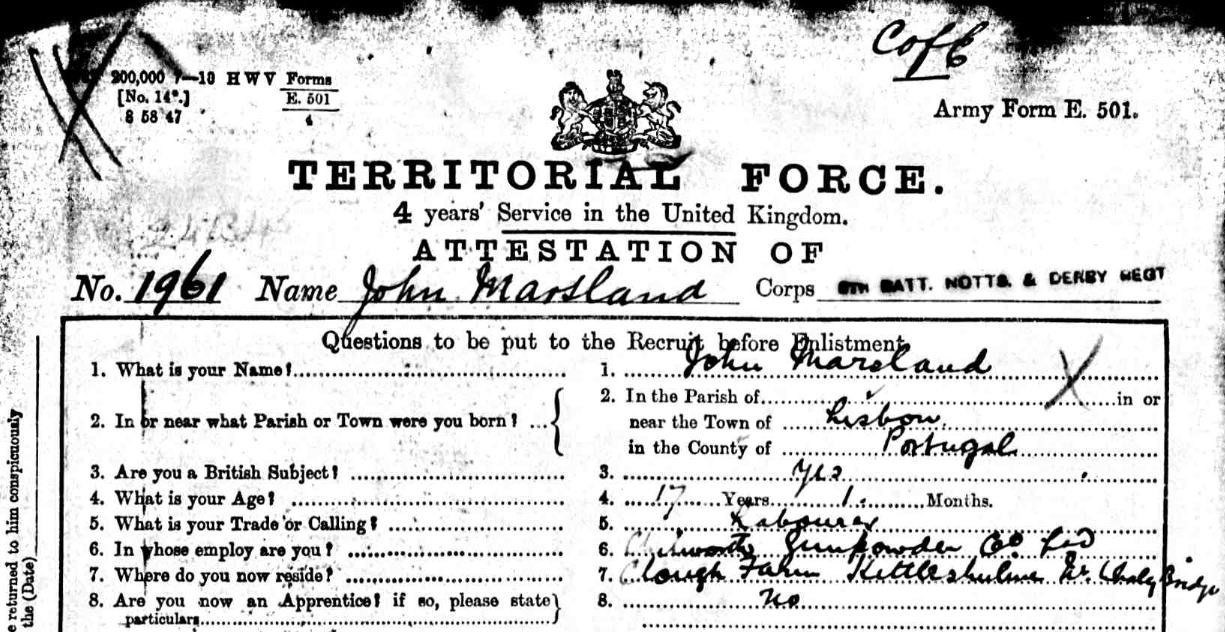 John has originally enlisted in May 1913 and gave his age as 17 years and 1 month; however, the 1911 Census records his birth in 1899 making him only about 14 years old.