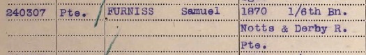 1870/240307 Pte Samuel Furness a farm labourer from Bakewell enlisted in April 1913. Arrived in France in 1916 and served with “C” Company. Wounded on 1.7.17 at Cite St Pierre. Discharged on 27.11.18 and later awarded TFWM.