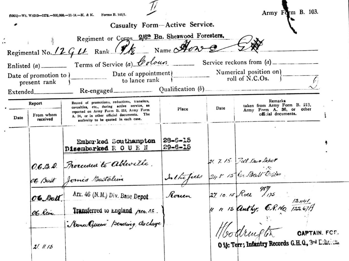 On November 1914 the 46th North Midland Cyclist Company was established and Commanded by Captain BH Winder. Albert transferred to this Company and accompanied them to France on the 28th February 1915.