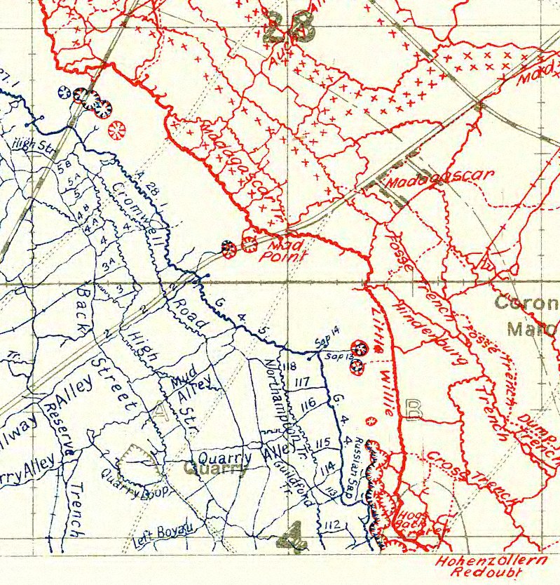 2/IX/17: At 4.55 am enemy put down heavy barrage of artillery and trench mortars of various calibre’s on our front and support lines and CTs of right sub sector (Map 36c NW ref A28C & G4B).
