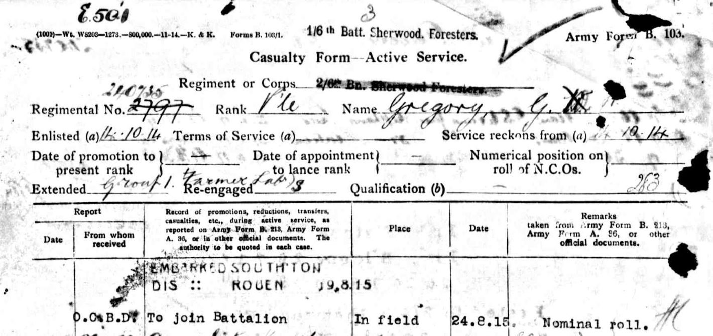 Service Record for 2797 Pte Gregory recording his arrival in France with the III Reinforcement in August 1915 and subsequent posting the Battalion on the 24th August 1915. Its is unlikely that the men joined the 1/6th Battalion in the front line trenches, but remained in Brigade Reserve until such time the Battalion were relieved from front line trench duty.