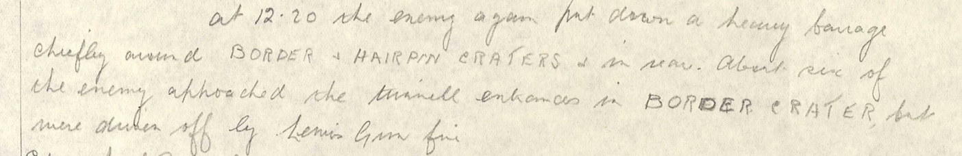 At the time all our Posts were standing to an opened heavy Lewis Gun and Rifle fire, particularly across the North side of LOOKOUT Post, where large numbers of the enemy were seen. The whole of No Mans Land between HAIRPIN CRATERS & LANCER was plastered with Lewis Gun and Rifle fire.