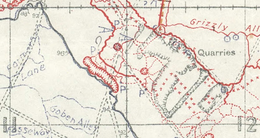 On the 8th Battalion S.F. front owing to “SOS LANCER” practically covering HAIRPIN CRATERS the Company Commander did not consider it necessary to send “ATTACK QUARRIES”. Between 9.35 & 9.45 pm. various enemy groups approached the Post to the rear and left of HAIRPIN i.e. STUDIO II and RAT CREEK. The groups appeared to consist of 8-12 men. All groups seemed quite confused and our men had no difficulty in driving them off with Rifle and Lewis Gun fire. One of the enemy parties on being challenged replied “FREUND” and another “SECHSISCHE”.