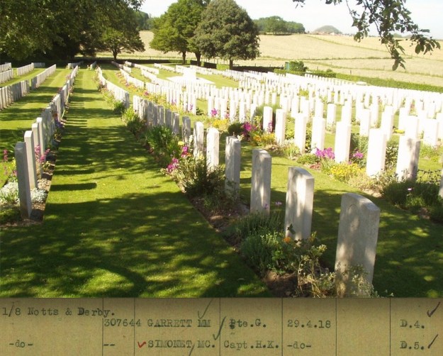 He had moved his Company Headquarters from an unprotected hellhole to a cottage at Les Facons, in the outpost line itself, only to get a direct hit on it almost immediately which resulted in Simonet and his runner Pte Garratt, one of the most reliable and gallant men in the Battalion, being badly wounded. Neither recovered, and they were buried near each other in the Cemetery at Lapugnoy”