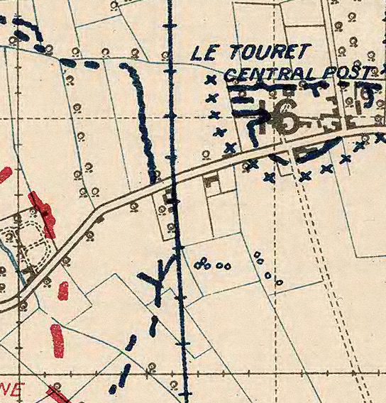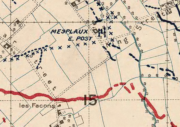 One of the latter was a bold reconnaissance of area X.16.c.60.65. This patrol went out twice during the morning and once during the afternoon, when the Officer was killed by a bullet from house X.16.c.60.65. His body could not be recovered owing to heavy rifle fire.