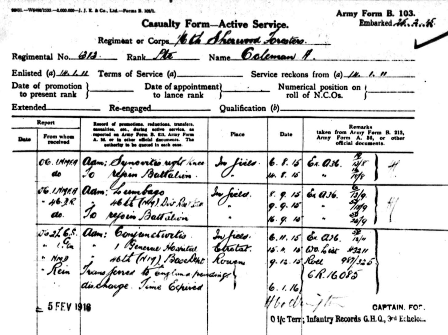 1313 Pte. Albert Coleman who suffered from lumbargo and was admitted to 1st NMFA and 46 DRS. He re-joined Battalion on 16.9.15.