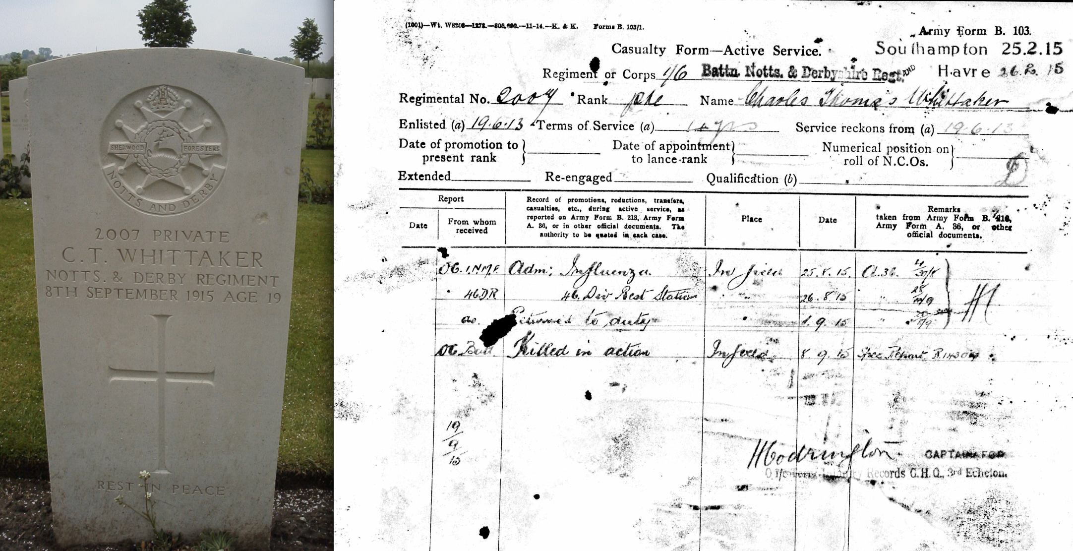 2007 Pte. Charles Thomas Whittaker, a 20 year old miner from Alfreton was killed in action on this day and buried in Spoilbank Cemetery. Charles enlisted in June 1913 and served with “G” Clay Cross Company.