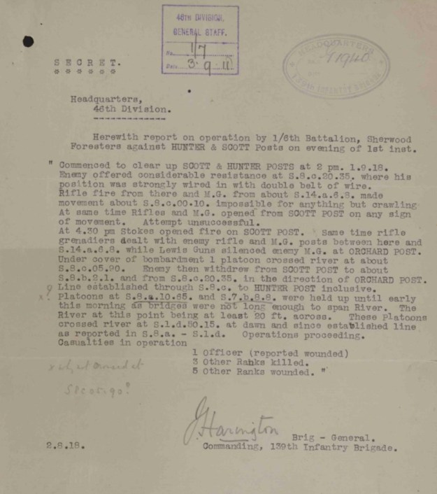 On this day 1st September 1918: operations against Scott and Hunters Posts