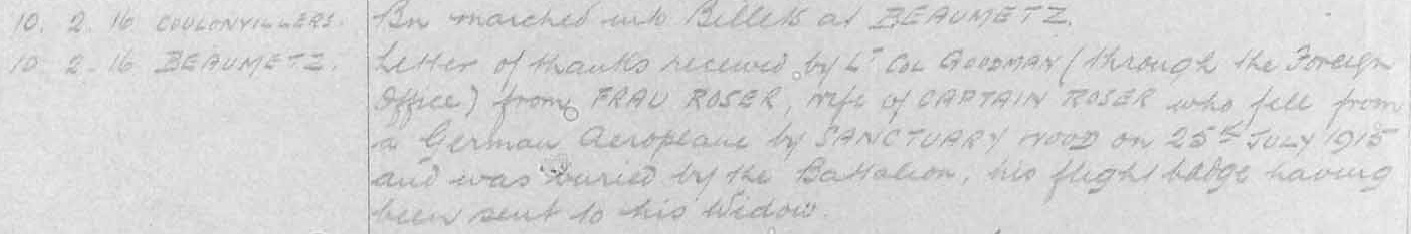 Also on that day they received a letter of thanks from FRAU ROSSER, wife of CAPTAIN ROSER who fell from a German Aeroplane by SANCTUARY WOOD on the 25th July 1915 and was buried by the BATTALION, his flight badge having been sent to his widow.
