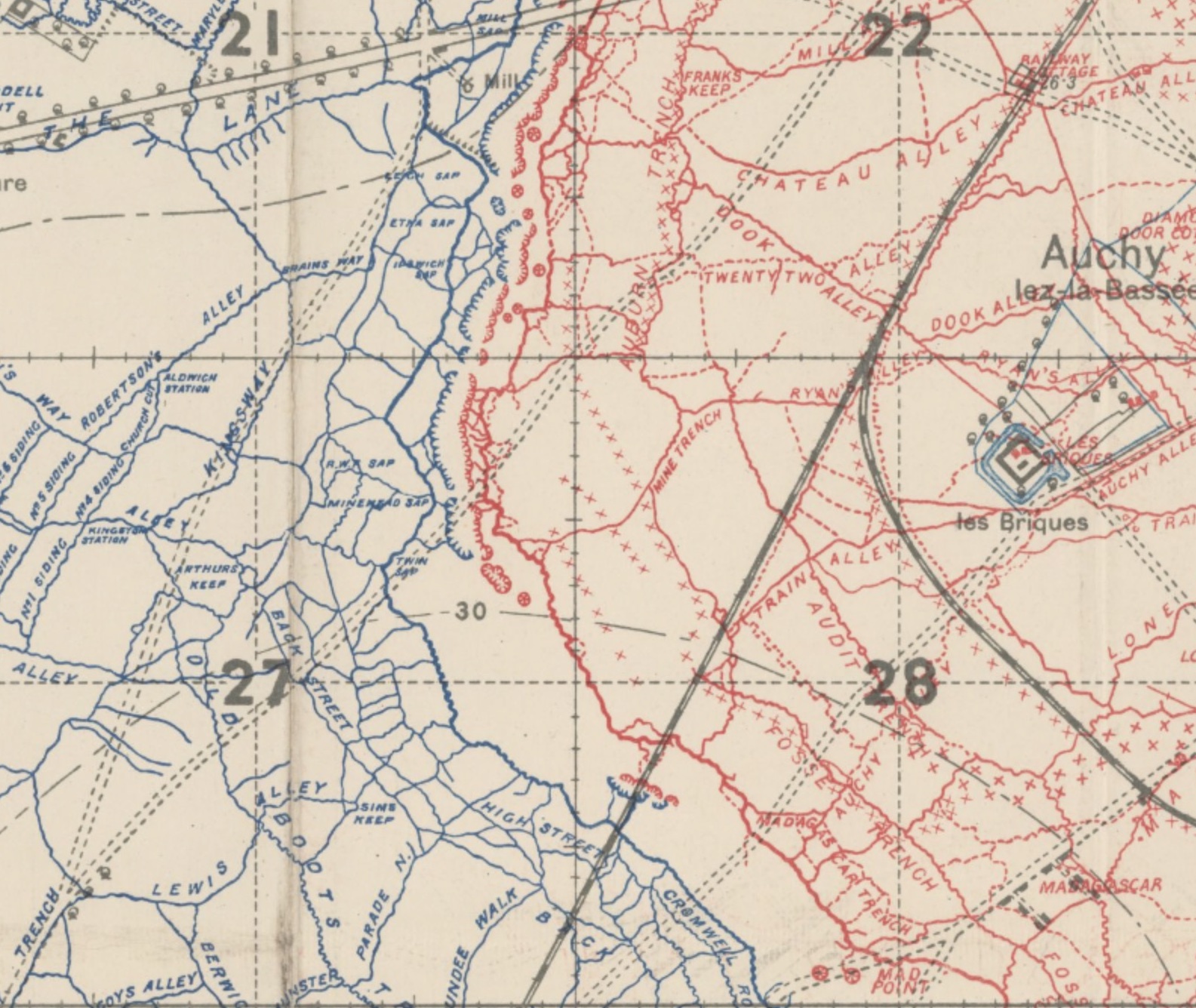 During the night of March 21/22nd, we did experience a real touch of the offensive in the shape of a big raid on the right Company, the most vulnerable portion of the line on the whole Brigade front. This front, which was held by A Company was of enormous length, extending from Railway Craters on the right to Munster Parade on the left, a distance of about 600 yards.