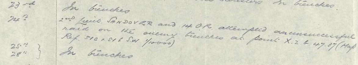 Lieutenant SANDOVER hearing a party working to his right front endeavoured to find a gap in the German wire between the RAVINE and the BLOCKHOUSE. After passing through two rows of wire he and Sgt LOOMES were cutting through a third row when they were challenged by the enemy’s sentry 15 yards from them who threw four hand grenades. Finding it was impossible to surprise the enemy’s post Lieut. SANDOVER ordered his party to withdraw. In the meantime Rifle and Machine Gun fire had been opened from the German trench & Cpl JOHNSON was hit in the head. Lieutenant SANDERSON dragged the Corporal through the wire with the assistance of Pte MARRIOTT who had returned to help him & the whole party gained the cover of the river bed without further casualties.