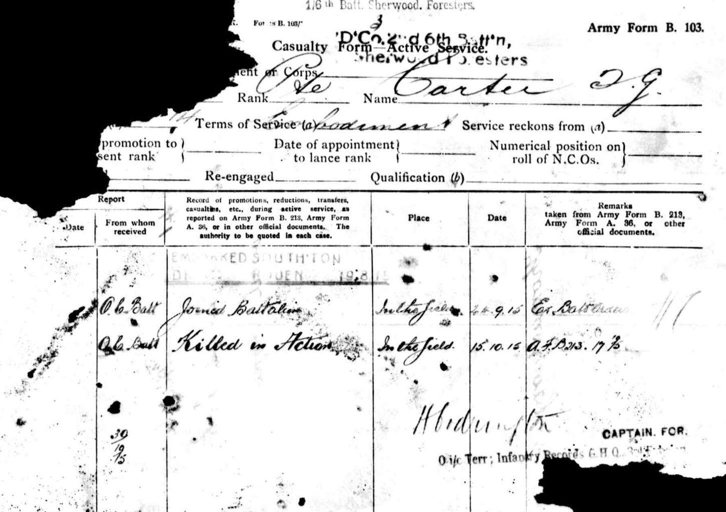 Army Service Record for 3541 Pte Carter recording his arrival to the 1/6th Battalion on the 24th September 1915.