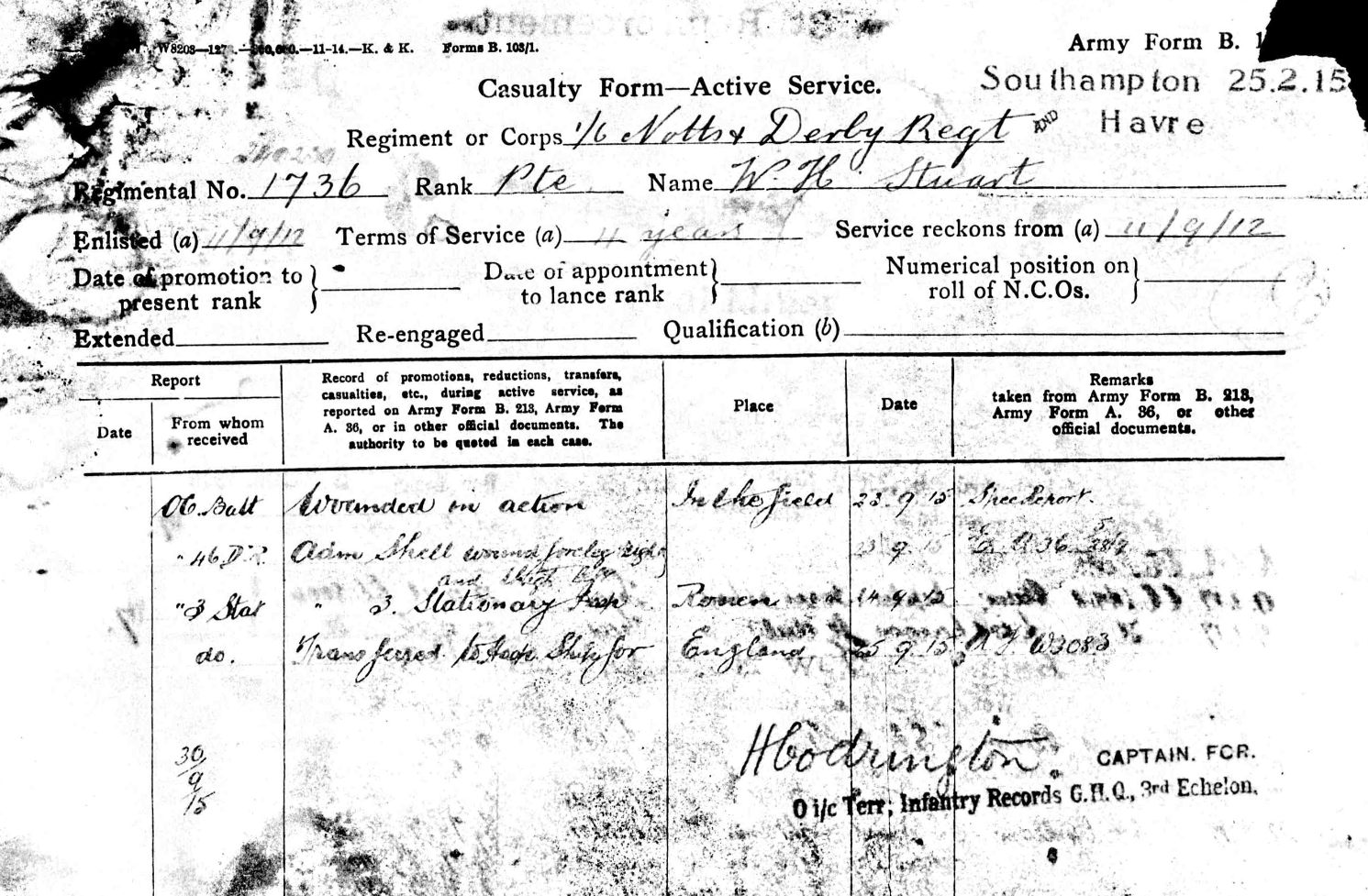Shell wound in right foreleg and left thigh. Admitted to 46 DRS and 3 Stationary Hospital. Transferred to England on 15.9.15. Returned to France on 3.7.16 with the 13th Reinforcement. |