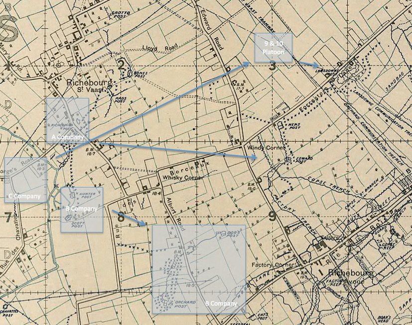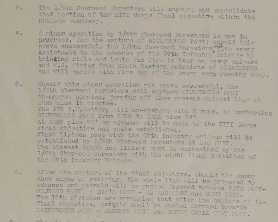 5.9.18: Artillery active over the whole area. One shell hit HQ of 8th Sherwood Foresters and wounded Lieut Col.- RW CURRIN DSO and all his HQ staff, with the exception of his 2nd in Command.