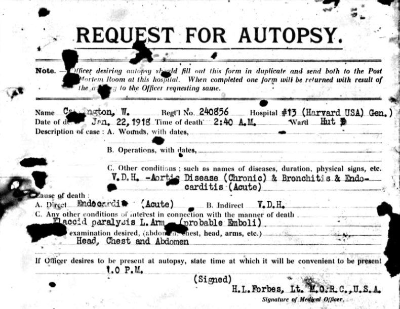 The autopsy request signed by Lt. Henry L Forbes of the MEDICAL OFFICERS RESERVE CORPS, United Sates Army (for more information see here MORC USA). This form confirms that William was treated in the 13 (Harvard) American Red Cross Base Hospital.