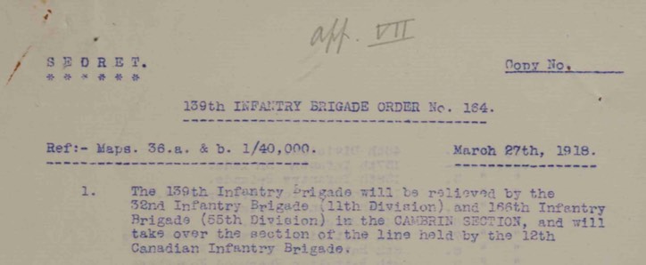 27.3.18 CAMBRIN SECTOR: Battalion relieved by 1/5th South Lancs and 6th York & Lancs Regt (32 Infantry Brigade) and moved to billets in SAILLY LABOURSE.