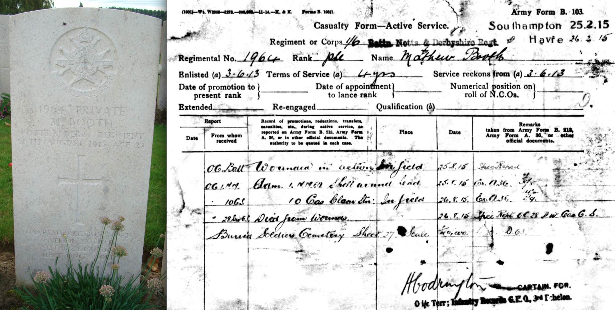 1964 Pte. Matthew Booth, a 28 year old quarryman from Wirksworth suffered a shell wound to the head on 25th August and was admitted to 1st NMFA, 10 CCS and 28 Div CCS. He died of his wounds on the 26th April and was buried in Soldiers Cemetery.