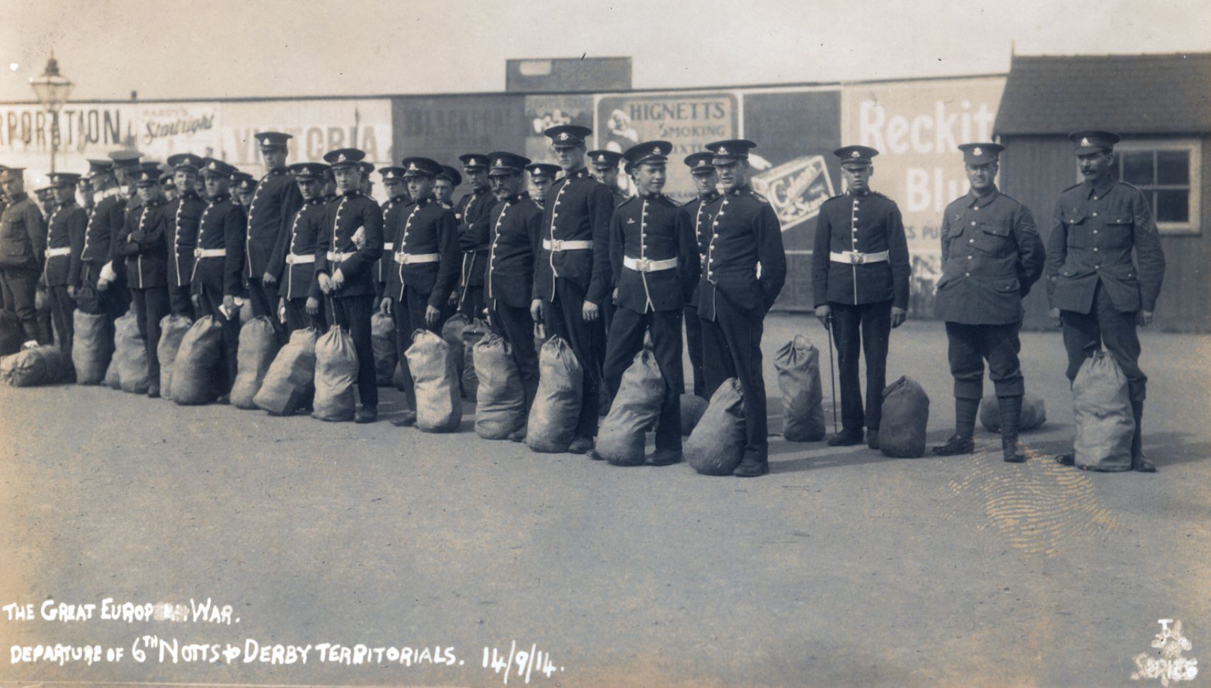 This picture, which is part of the JH Waterhouse Series shows men of the 6th Notts & Derby Territorials preparing for departure possible from the Midland Railway Station. Interestingly the date is given as the 14th September 1914, which was nearly 6 weeks after the Battalion had originally left Chesterfield for Harpenden. The men are parading in Tunic Order so it is possible that these are former members of the battalion who had reenlisted on the out break of the War, or were the first ‘new recruits’ to the Battalion. Indeed, a group of 62 men who enlisted on the 1st September were numbered alphabetically from 2264 to 2334 and had signed the Imperial Service Agreement at Chesterfield which was witnessed by Captain Welch.