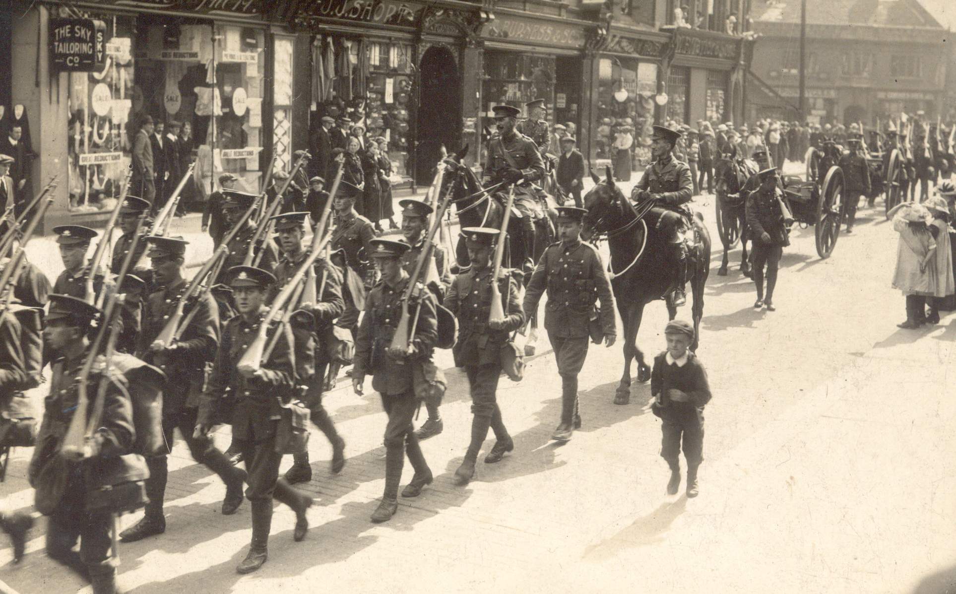 “H” (Southwell) Company, 8th (Nottinghamshire) Battalion leaving the town for active service on 7th August 1914 (Howard Barrett, Southwell).