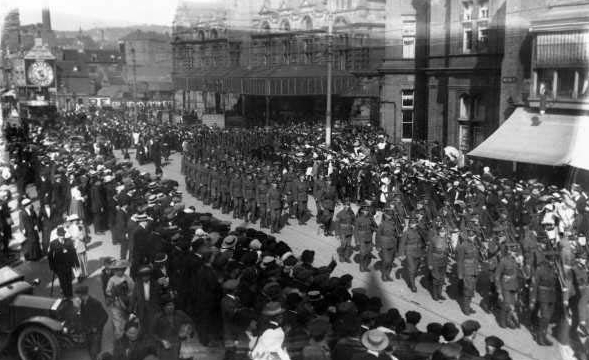 The men are marching down Lordsmill Street on their way to the Midland Railway Station with Colonel Clayton and Major Goodman following the Regimental Band.