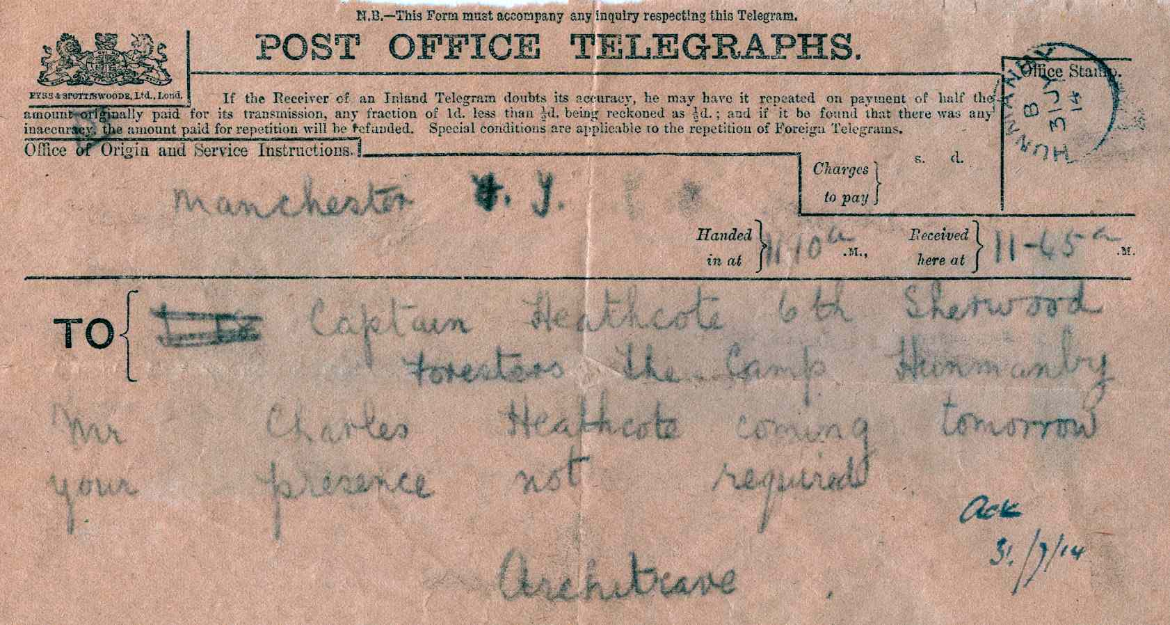 A telegram sent to Captain Edgar Heathcote on the 31st July informing that his father was visiting the Camp from Manchester (many thanks to David Wilkins).