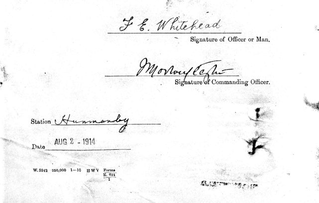Imperial Service Agreement signed by 2049 Pte. Frederick Whitehead on the 2nd August, just two days before the outbreak of War.