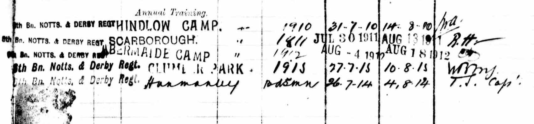 Army Service Record for 1188 Pte. John Wright of “G” (Clay Cross) Company recording his attendance at the 1914 Annual Camp held at Hunmanby from 26th July to 3rd August.