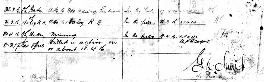 1988 Pte John Fewkes (1/5th Battalion) aged 19 and a miner from Linton near Swadlincote. Missing in action on the 19th April 1916 with the 180 Tunnelling Company (WO 95/488) and Commemorated on the Arras Memorial.