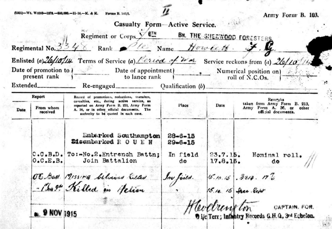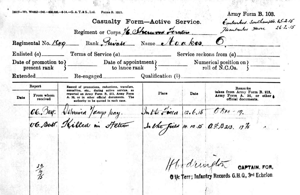 Army Service Record for William Mellors showing his arrival in France on the 25th February 1915. He was admitted to the 10th Casualty Clearing Station and 23rd General Hospital (Rouen) in September 1915 suffering with rheumatism. After spending two weeks in the North Midland Base Depot he returned to the 6th Battalion on the 7th October 1915. He was killed in action seven days later.